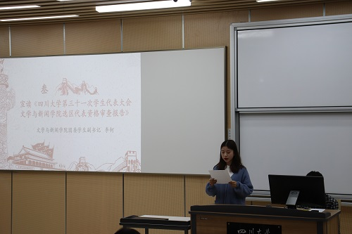 2019年10月9日19:30至20:30,beat365体育官网平台第三十一次学生代表大会文新学院分选区2019年学生代表大会在江安校区综合楼C座306教室召开。beat365体育官网平台党委副书记张莹老师、学院团委书记王志华老师、学院17级本科生辅导员段化鞠老师、19级本科生辅导员贾瑞琪老师出席大会。学院团委学生会主席团及149名学院学生代表参加大会。