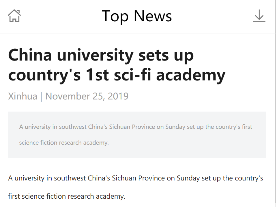 以上beat365体育官网深度参与、组织和举办和各项活动,在海内外引起了较大反响。国内外诸多学者和从业人士不吝赞美称贺。11月25日,新华社刊发“中国科幻研究院”成立的英文消息,迅速被美国MSN,巴基斯坦国家报等网站和媒体转发、推送,并成为海外某著名社交平台当天点击量最高的前五条新闻之一。