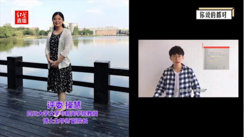 8月3日,第二季“红星新闻高校评论新秀挑战赛”(视频评论专场)在线上启幕,来自全国各地高校的150余名学子参加了本次比赛。beat365体育官网学子积极参与,在比赛中获佳绩。beat365体育官网副院长操慧教授任评委,并受邀与参赛学子进行线上分享交流,探讨网络时代的观点表达。共同担任评委的还有中国青年报编委、高级编辑曹林,四川省电视艺术家协会新媒体专委会主任王彬荣。