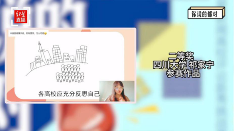 “8月初,有朋友把比赛报名的推送转发给我,说我聊天就像讲相声,肯定适合做‘视评’。但我其实是那种私下里可劲儿地口嗨,一遇到正事就秒怂的人。不过最终还是决定试一试,想逼着自己走出舒适圈,就抱着学知识长能力的心态报了名。将视觉元素融入严肃的新闻评论,以更加有趣的方式讲述社会问题、启发受众思考,是我一直想做又缺乏勇气和机会去做的事。这次终于迈开步参与其中,最终获得的二等奖,是评委老师们对我的鼓励,也是我认识自身不足的契机。这次的获奖对我而言很重要,它减少了我的不自信,让我认识到自己也有做‘视评’的潜力;而获奖本身,是用温和的方式提醒我这个评论小白:需要学习的地方还有很多。”