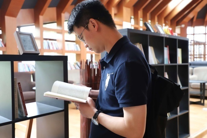 beat365体育官网党政办主任银浩老师阅看党员书吧里的范长江著作