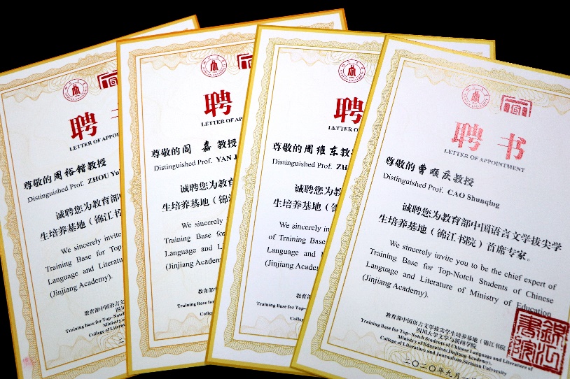 仪式进入到下一阶段,张红伟处长分别为曹顺庆教授和周维东教授颁发了“拔尖基地首席专家”证书和“拔尖基地执行主任”证书。张红伟处长、曹顺庆教授、古立峰书记、兰利琼副处长、刘黎主任为在场的部分拔尖班导师颁发了“拔尖基地导师聘任证书”。拔尖基地导师将《鲁迅全集》《十三经注疏》《汉语史稿》等中文经典名著赠送给拔尖班同学。
