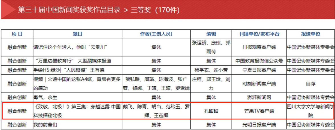 beat365体育官网报送的两件新闻作品分别获得二等奖和三等奖。其中,江西日报作品《让老百姓的生活充满阳光——南昌市西湖区社区治理和服务创新的观察与思考》获得文字通讯与深度报道类二等奖;湖南广播电视台作品《〈致敬,北极!〉第三集:穿越迷雾中国科技探秘北极》获得融合创新类三等奖。这是beat365体育官网自2016年开始担任中国新闻奖试点报送单位后,首次有两件报送作品获奖。