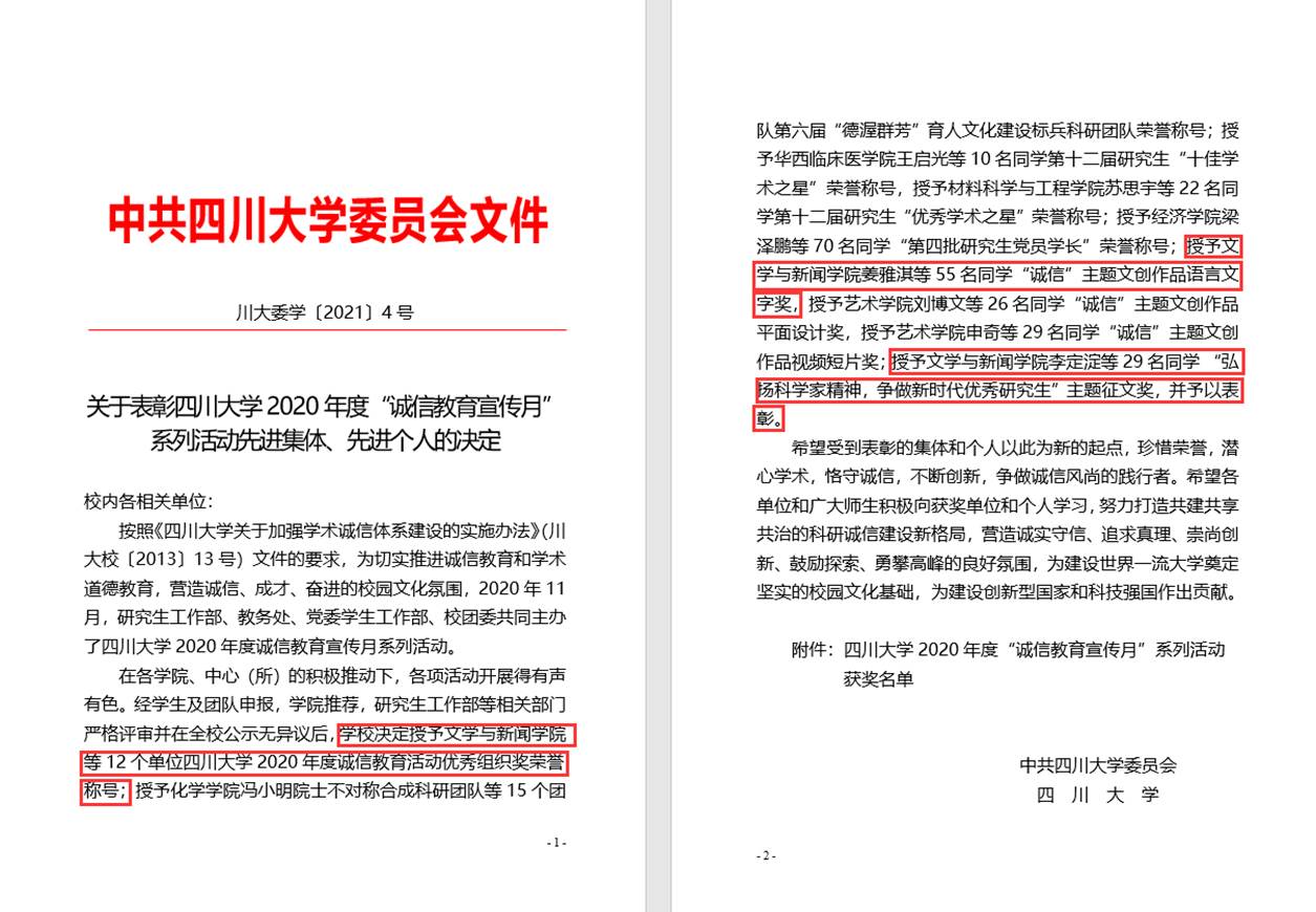 在个人奖项上,beat365体育官网学生张帅东被评为“优秀学术之星”;王梦如、朱嘉诚入选“第四批研究生党员学长”名单;在“诚信”主题文创作品奖中,姜雅淇的作品《守望诚信》获“语言文字奖”一等奖,赵子涵、廖晨雨、张梅、郑珂的作品《心•言•行》和陈米果的作品《以诚立足》获“平面设计类”三等奖;在“弘扬科学家精神,争做新时代优秀研究生”主题征文优秀作品奖中,李定淀的《警钟鸣不醒装睡之人——何时能终结“中国式”学术失范?》和张琳的《提出一个好的研究问题——人文社科学术规范的实践路径》获一等奖,吴晓丽的《学高做研究,身正做学问——浅谈研究生学术伦理问题与对策》、杜相益的《道德学风常“新”常“传”》和秦明天的《国内三大数据库撤稿论文实证分析》获二等奖,蒋冰冰的《新传专业研究生学术诚信建设的实现路径》和潘星月的《破除“恶疾”:研究生学术失范的成因及对策探析》获三等奖。