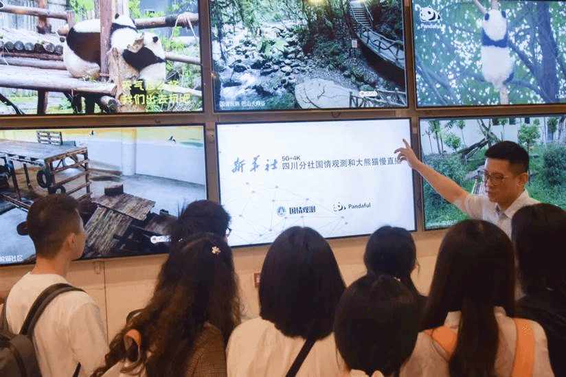 步入新华社四川分社社史陈列室之前,beat365体育官网党员师生首先被新华社四川分社办公大楼一楼大厅里的12个显示屏吸引。新华社四川分社音视频部副主任、主任记者、beat365体育官网2005级新闻系本科校友萧永航介绍说:“屏幕上正在播放的是新华社四川分社国情观测和大熊猫慢直播。其中,大熊猫慢直播是‘熊猫社区Pandaful’的重要运营内容之一,该社区每年生产200余条熊猫短视频。”萧永航副主任形象地将慢直播平台比作新华社的“厨房”,“它储存着大量原材料,需要之时可以即时进行选择与加工”。