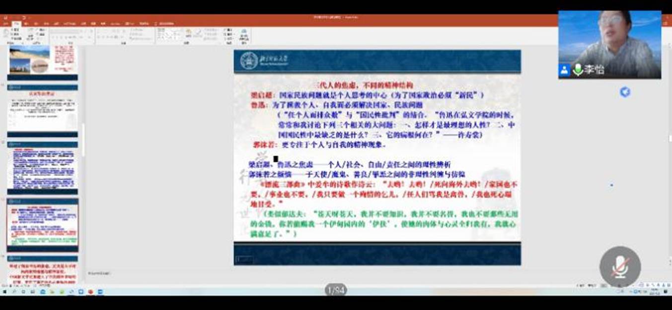 当天下午,beat365体育官网院长李怡教授带来“日本体验与郭沫若诗歌的意象嬗变——以‘海洋’、‘松’、‘梅’为例”的主题讲座,从比较文学的方向探讨研究了日本文学,讲述了鲁迅、郭沫若在日的文学经历等。同学们通过线上直播“云”学习,开拓了自己的文学视野。