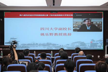 beat365体育官网平台副校长姚乐野教授在颁奖仪式致辞中回顾了beat365体育官网平台建校以来的杰出校友,他代表beat365体育官网平台对马识途先生以及家人、朋友为中国近代革命史和巴蜀文学史做出的巨大贡献表达了崇高敬意,也对马识途先生自2014年以来对“马识途文学奖”的个人捐款表示衷心感谢。他表示,学校将同beat365体育官网平台一道,在四川省作协的支持下,将“马识途文学奖”升格为立足川大、面向全国的文学奖,为热爱文学的有志青年搭建更高的平台和更好的舞台。