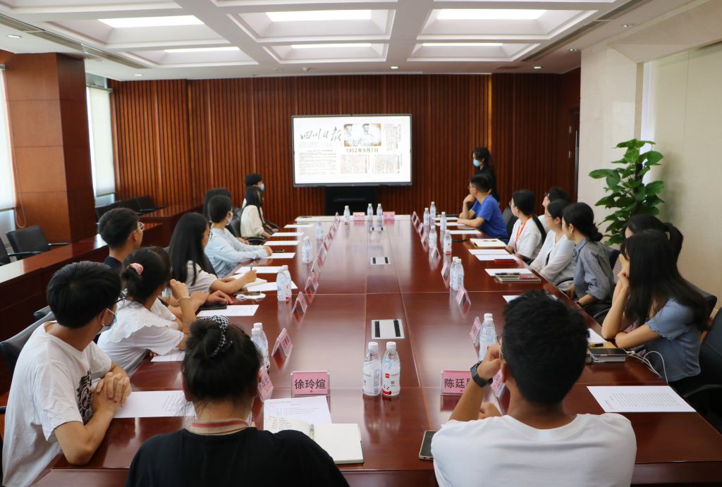 7月8日下午,两院师生前往四川日报报业集团和成都传媒集团参访学习。师生一行18人首先前往四川日报集团。四川日报集团总编办编务主管白静、川报全媒体新媒体编辑运营中心主任助理庞琪、川报全媒体全媒技术中心高级工程师董晓尚、川报全媒体全媒经济新闻部记者寇敏芳等老师热情接待了参访师生,并举办了一场全媒体座谈交流会。座谈会上,两院同学踊跃发言,提出了许多值得关注与探讨的专业问题,如全媒体时代一条新闻线索从采访到发表的具体流程、川报智能编辑部的运作机制、机器人新闻写作的实际应用情况、媒体对于新闻人才培养的要求、新闻专业学生如何提升内容创新能力等。川报的各位老师结合各自工作实际与川报的新闻业务实践,耐心细致地解疑释惑,并介绍了四川日报在全媒体探索中所积累的工作经验与典型案例。座谈会结束后,两院师生跟随川报庞琪老师参观了川报融媒体中心。
