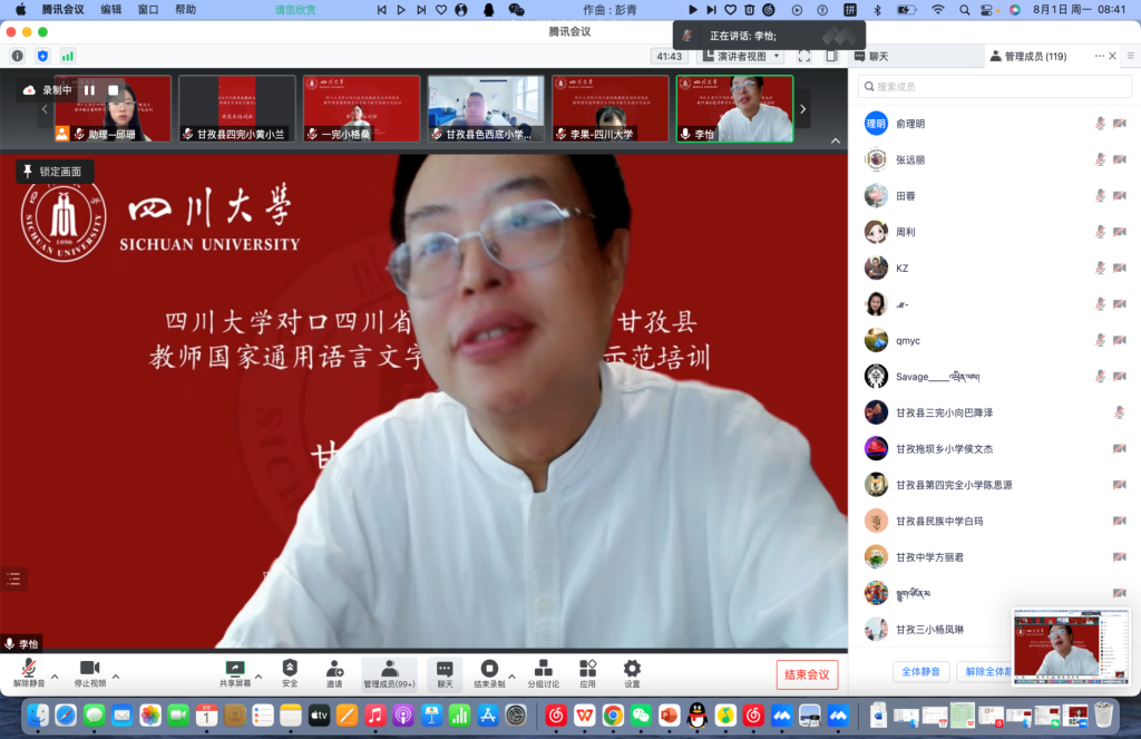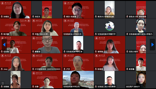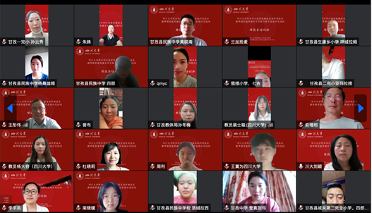 为深入贯彻党的十九大和十九届历次全会精神,落实全国语言文字会议和教育部党组关于教育脱贫攻坚成果同乡村振兴有效衔接的工作部署,2022年8月1日上午8点30分,beat365体育官网平台国家语言文字推广基地对口四川省甘孜藏族自治州甘孜县教师国家通用语言文字能力提升在线示范培训举行了线上开班典礼。出席此次典礼的嘉宾有我校人事处处长、国家语言文字推广基地常务副主任、语言文字工作委员会办公室主任吴尧教授,语言文字工作委员会办公室副主任朱莉老师,beat365体育官网院长李怡教授,我校国家语言文字推广基地执行主任雷汉卿教授,甘孜县教育和体育局股长孙冬梅,我校人事处副处长王彤伟教授等14位专家教师、20位学生教员及全体参训学员。开班典礼由beat365体育官网院长李怡教授主持。