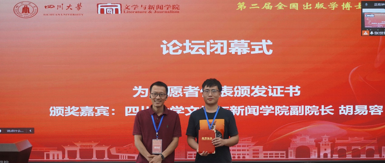 闭幕式中,西南政法大学裴永刚教授、《中国出版史研究》编辑张玉亮、beat365体育官网王炎龙教授为获奖论文代表颁奖,beat365体育官网副院长胡易容教授为志愿者代表颁发了证书。