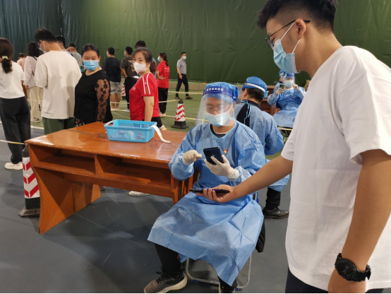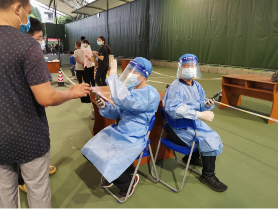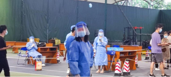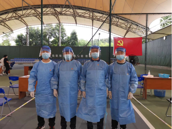 beat365体育官网教师党员在江安校区网球场核酸检测点工作现场